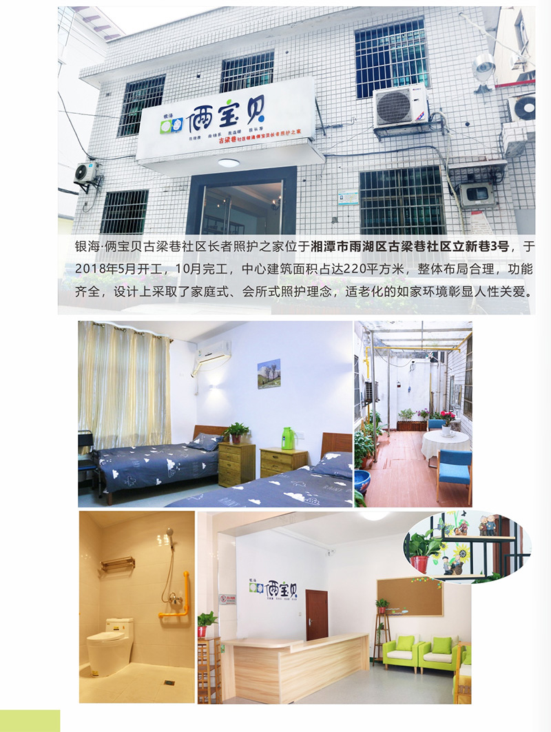 銀海·倆寶貝古梁巷社區(qū)長者照護(hù)之家位于湘潭市雨湖區(qū)古梁巷社區(qū)立新巷3號,于2018年5月開工,10月完工,中心建筑面積占達(dá)220平方米,整體布局合理,功能齊全,設(shè)計上采取了家庭式、會所式照護(hù)理念,適老化的如家環(huán)境彰顯人性關(guān)愛。